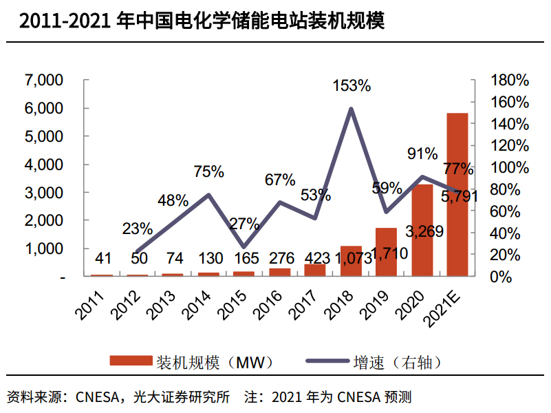 同时,“源网荷储一体化”推动储能市场与“风光”发电新能源市场繁荣共进。国家发改委、国家能源局《关于加快推动新型储能发展的指导意见》中首次明确了储能作为碳达峰、碳中和的关键支撑技术,明确了储能的发展目标与重点任务,2025年新型储能装机规模达3000万千瓦以上,接近2021年装机规模的10倍。